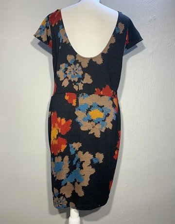Suga Suga dress. Black, red, blue and brown colouring. Has a low back. Floral patterning. Good condition.