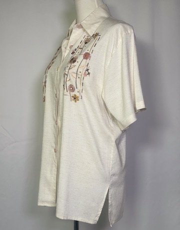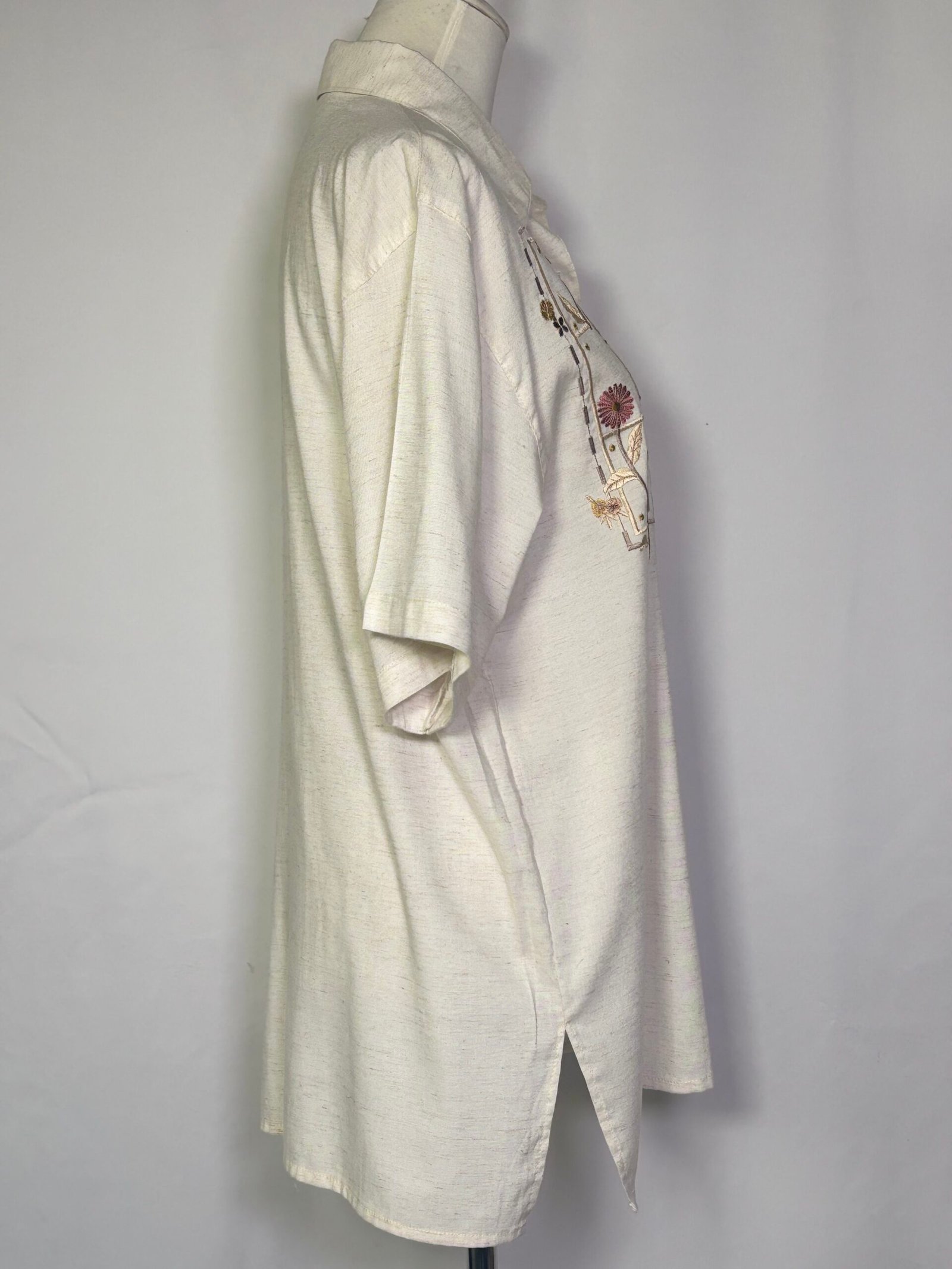 This charming cream shirt features beautiful floral embroidery on the front, adding a touch of elegance to a casual piece. With its relaxed fit and soft fabric, it’s perfect for warm days or layering in cooler weather.