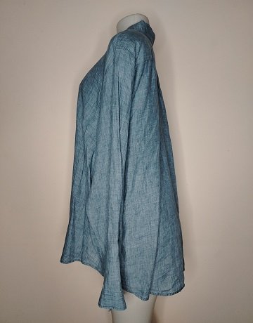 Blue/Grey French Linen Button-down long-sleeved shirt from Trenery – Size XX-Large. Collared. Longer length. Curved hemline. Loose fitting garment in excellent condition.