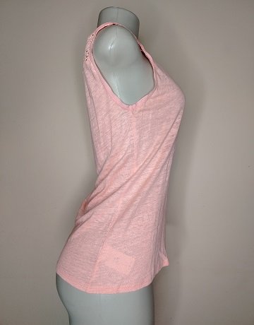 Apricot coloured Linen top from Trenery. Size – X-Small. Sleeveless. Scooped neckline. Shoulder and Bodice Lace inset. Easy to wear Linen top in good condition.