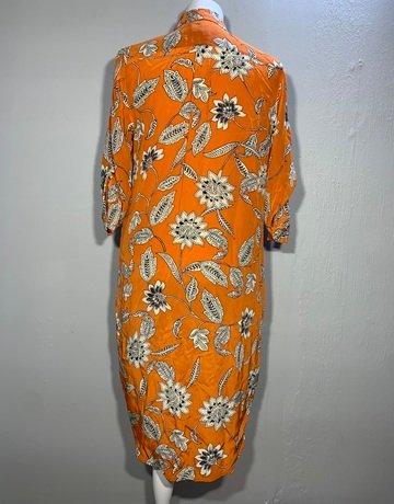 Trenery dress. Orange, black and white colouring. Patterned. Closes with buttons along the front of the dress. 100% Silk fabric. Good condition.