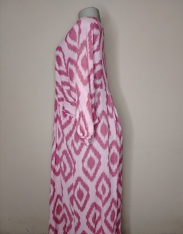 Pink & White Ikat Print Cotton Dress from Tribute. Midi length. Deep V-neckline. Textured Cotton (Cheese cloth) fabric. Wide, drapey sleeves. Loose fit. Boho style Tunic Dress in great condition.