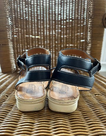 Tsonga sandals.Open, rounded toe with navy blue woven leather strap. Floral-printed footbed, and adjustable ankle strap. Good condition.