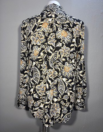 Witchery top. Black, cream and white colouring. Patterned. Closes with buttons along the front of the shirt. Good condition.