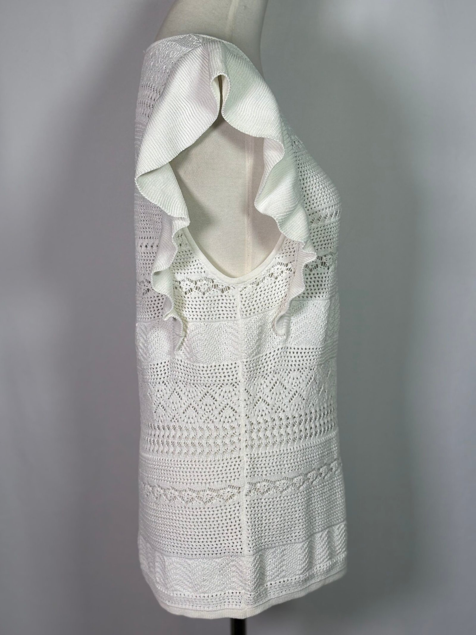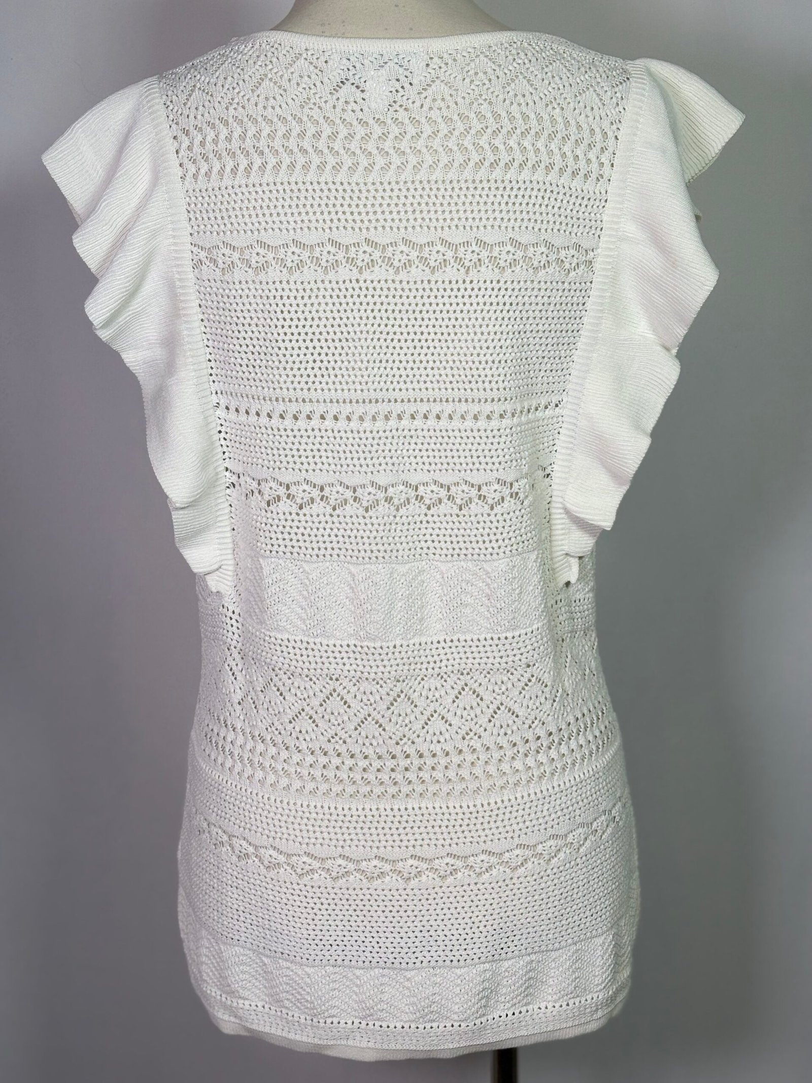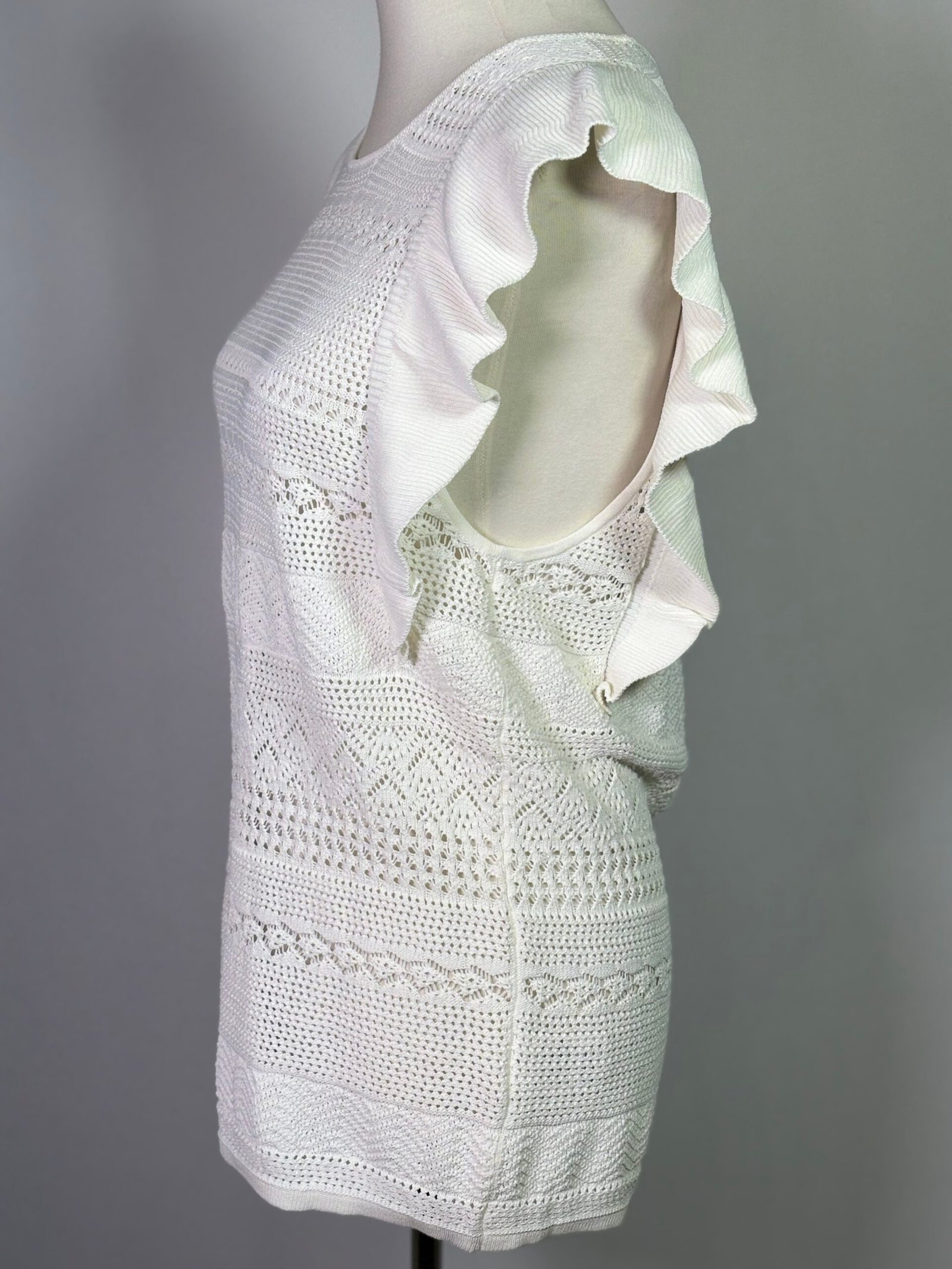 Stylish white top with ruffled sleeves and intricate lace detailing, perfect for a chic summer look.