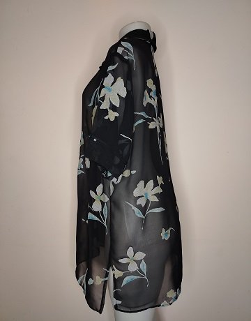 Sheer Black Blouse from Wortmann Original. Size – Large. Abstract Floral print. Button-through. Short sleeved. Collared. Loose fitting. Long length. Classic blouse in great condition.