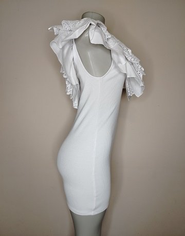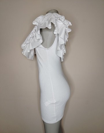 White Mini Dress from Zara. Size – Medium. Fitted design. Stretch Cotton fabric. Broderick Anglaise Collar – can be word of the shoulder. Garment in great condition.