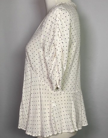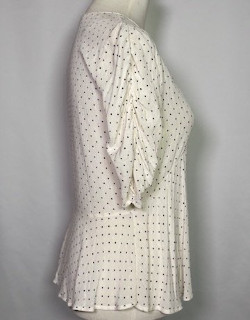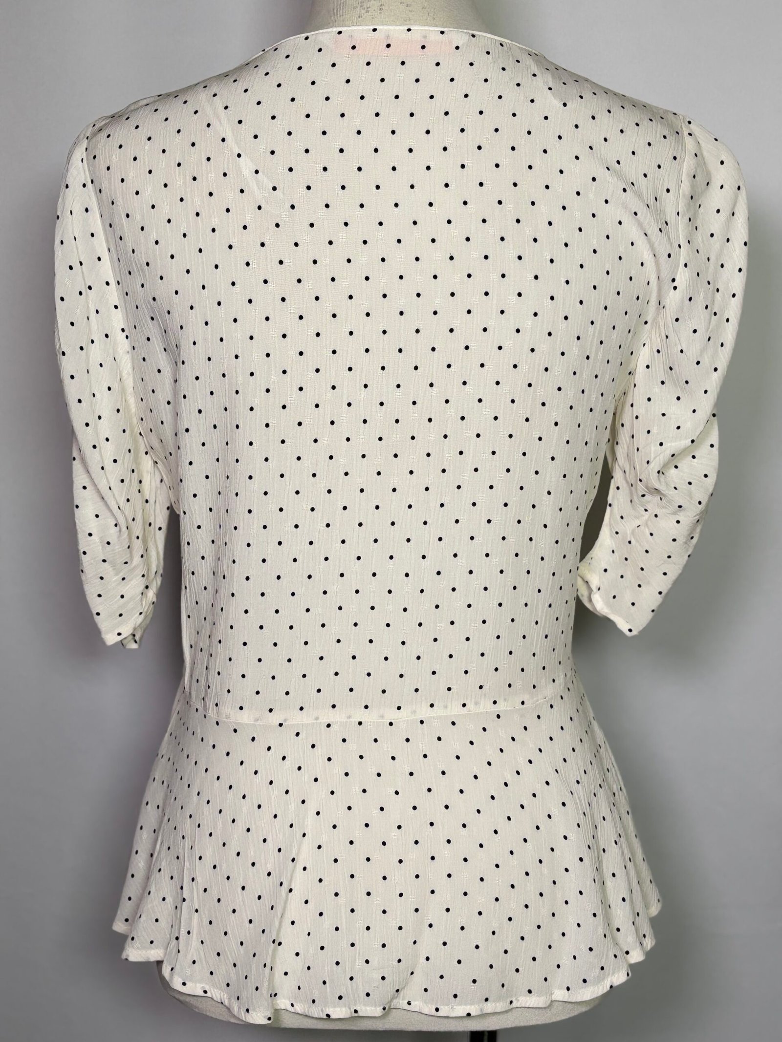 This charming top features a light cream color with playful black polka dots, perfect for adding a feminine touch to your wardrobe.